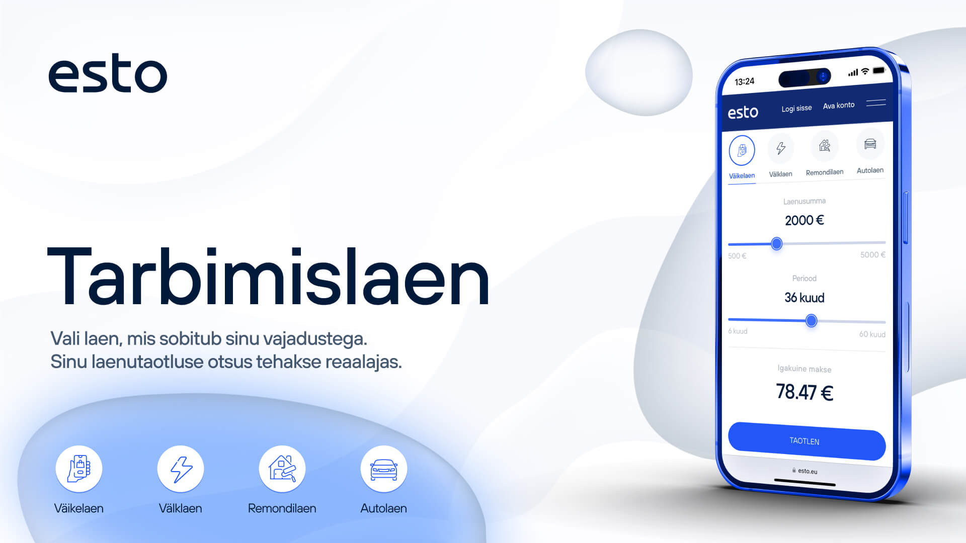 Sinu laenuotsus on personaalne, sƵltuvalt sinu valitud laenusummast, lepingu pikkusest ja krediidivƵimekusest. KƵik vajalikud tegevused saad ESTO iseteeninduses teha digitaalselt, olgu selleks siis taotlemine, laenugraafiku muutmine vƵi kasvƵi ennetƤhtaegne tagasimaksmine.