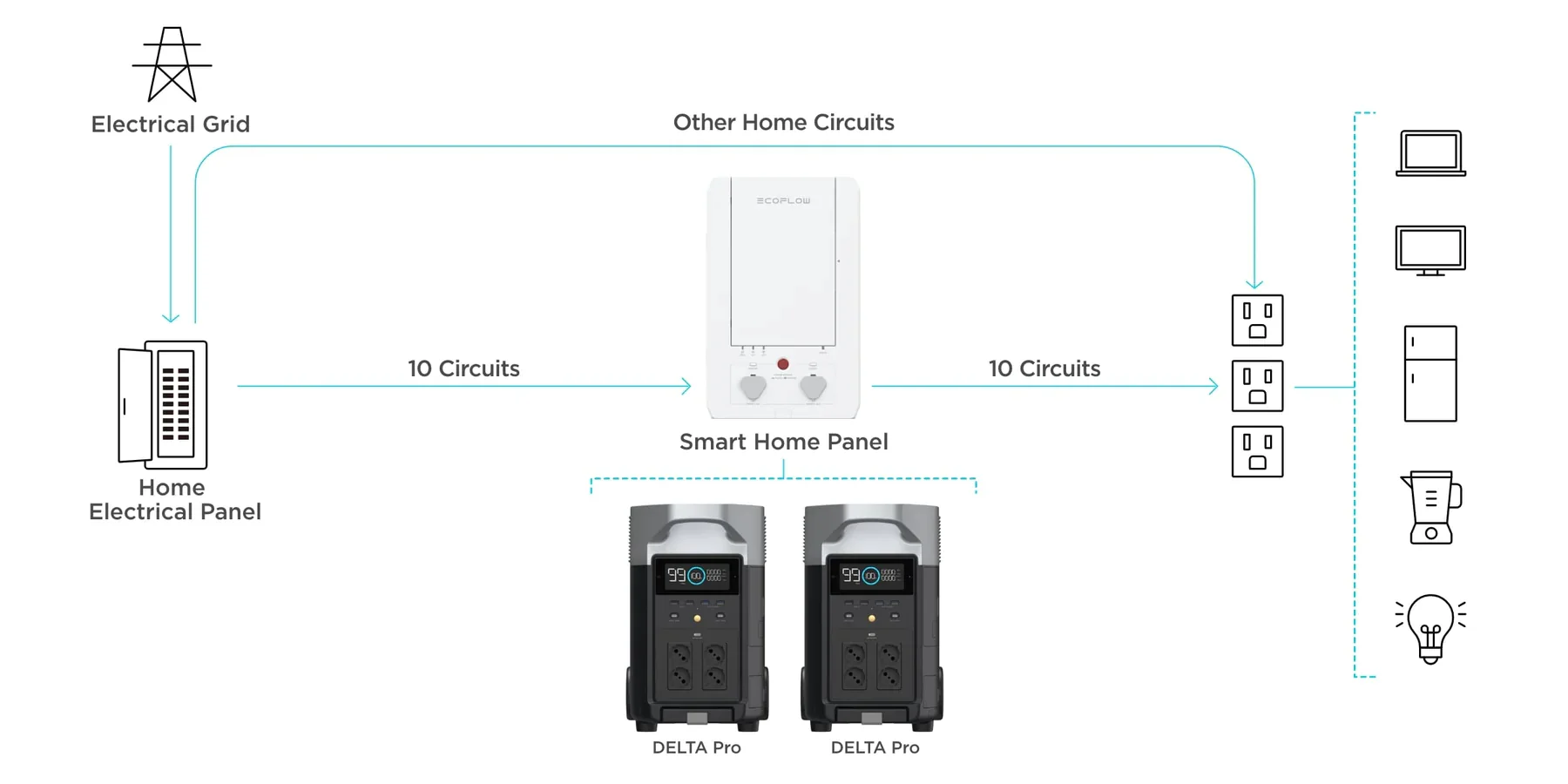 EcoFlow Smart Home Panel on DELTA Pro ökosüsteemi süda. See integreerib kuni kaks DELTA Pro seadet kuni 10 vooluahelaga peakilbist.