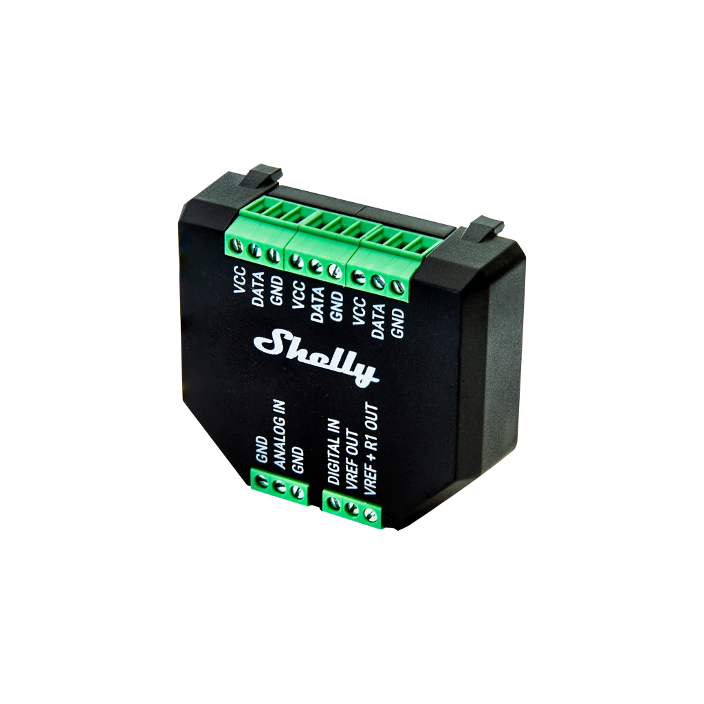 Lisandmoodul Shelly Plus seadmele Shelly Plus. Saab kasutada kuni viie DS18B20 anduri või ühe DHT22 anduriga. Analoog- ja digitaalsisend.