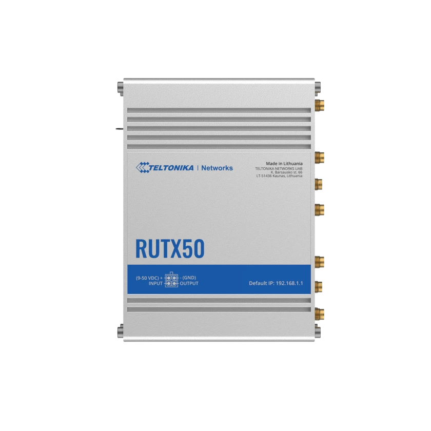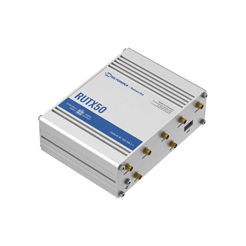 RUTX50 on kahe SIM-kaardiga mitme võrgu ruuter, mis pakub 5G mobiilsidet kiirete ja andmemahukate rakenduste jaoks.
