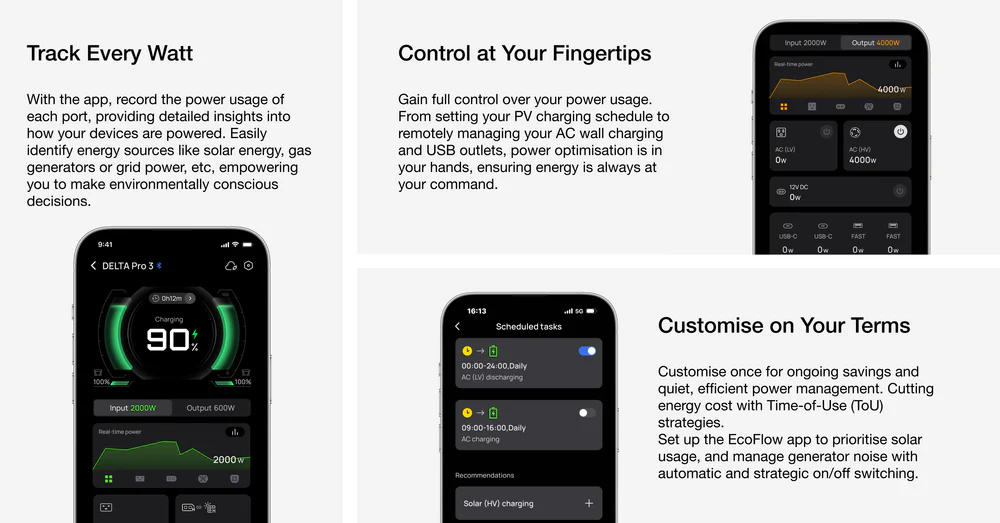 Autotööstuses kasutatavatest LFP akuelementidest valmistatud EcoFlow DELTA Pro 3-l on esimesena oma valdkonnas IP65 kaitseastmega aku, mis tagab vastupidavuse löökide, veele, tolmule ja tuleohu vastu. 4000 laadimistsüklit kuni 80% võite seda kasutada iga päev 11 aasta jooksul*. Kogege usaldusväärset jõudlust iga ilmaga, tagades meelerahu igas olukorras.
